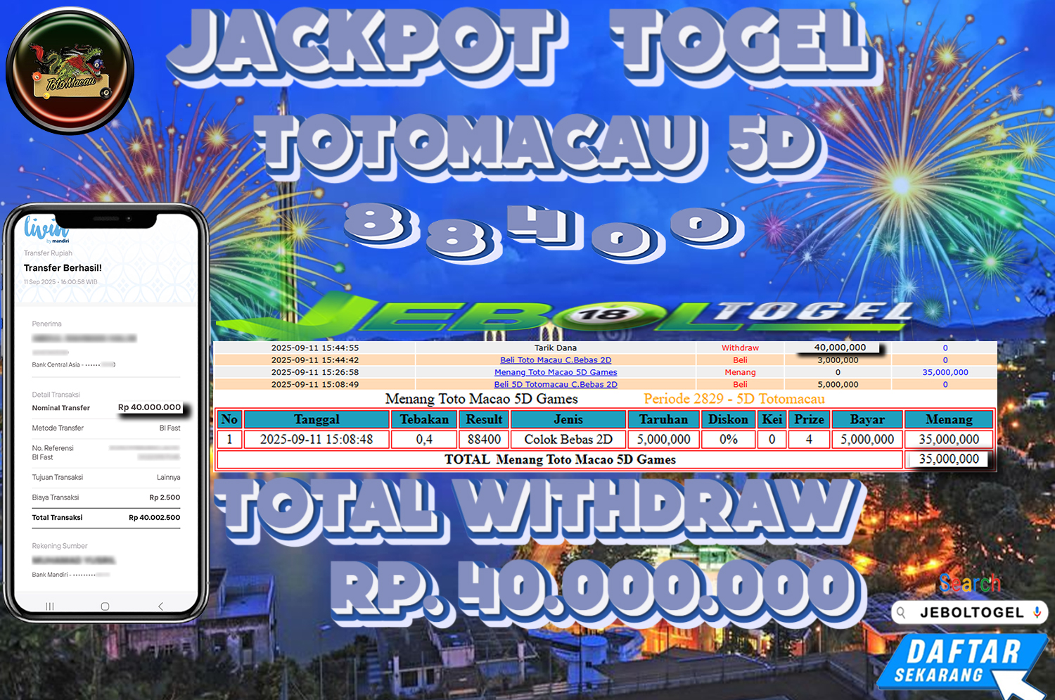 Kemenangan TOGEL PASARAN ( TOTO MACAU 5D ) Segera bergabung dengan kami JEBOLTOGEL, SITUS TERBESAR dan TERPERCAYA yang pasti BAYAR JP ANDA!