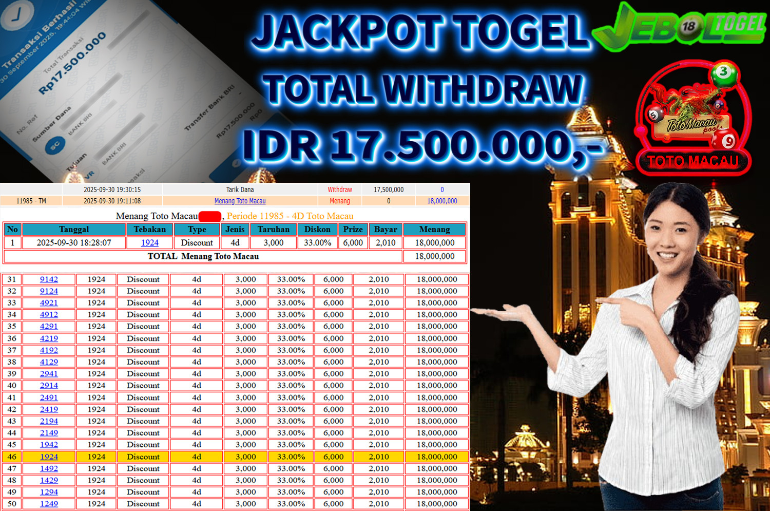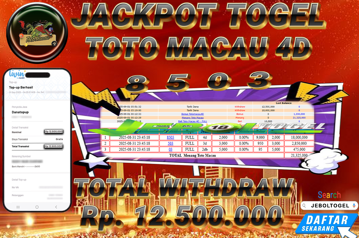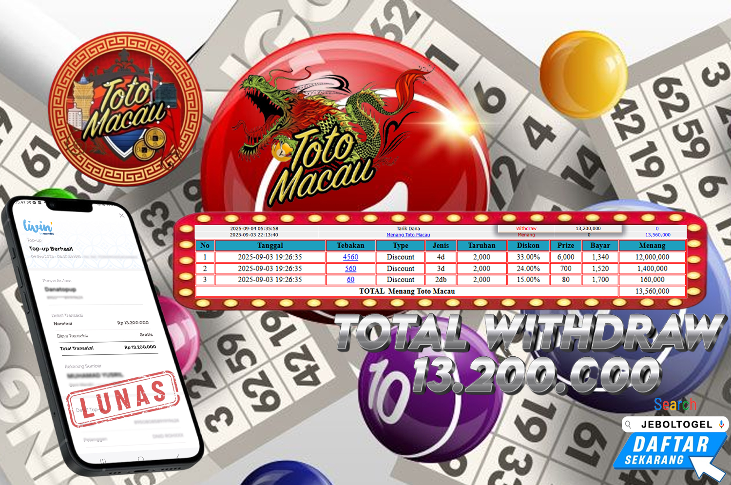 Kemenangan TOGEL PASARAN ( TOTO MACAU 4D ) Segera bergabung dengan kami JEBOLTOGEL, SITUS TERBESAR dan TERPERCAYA yang pasti BAYAR JP ANDA!