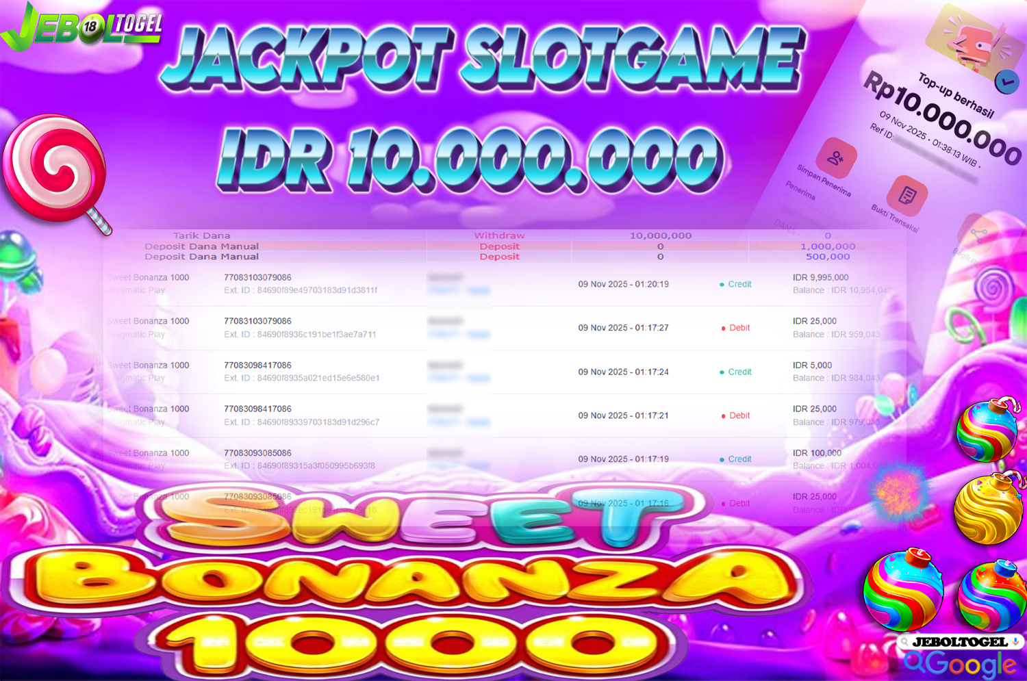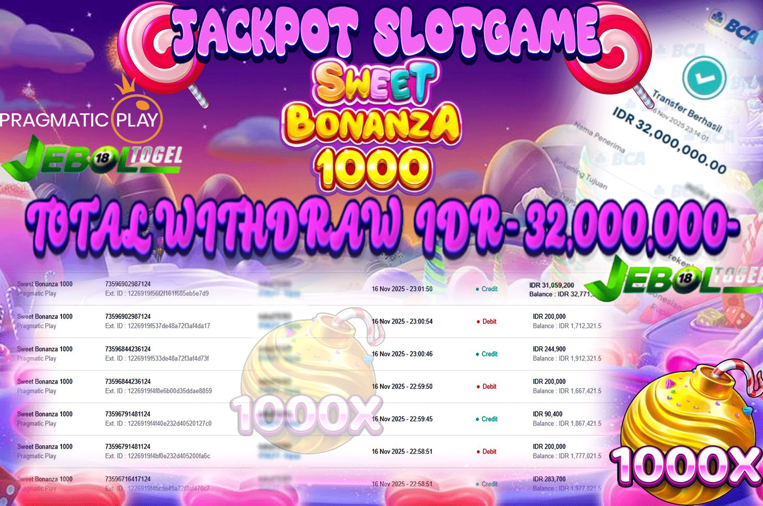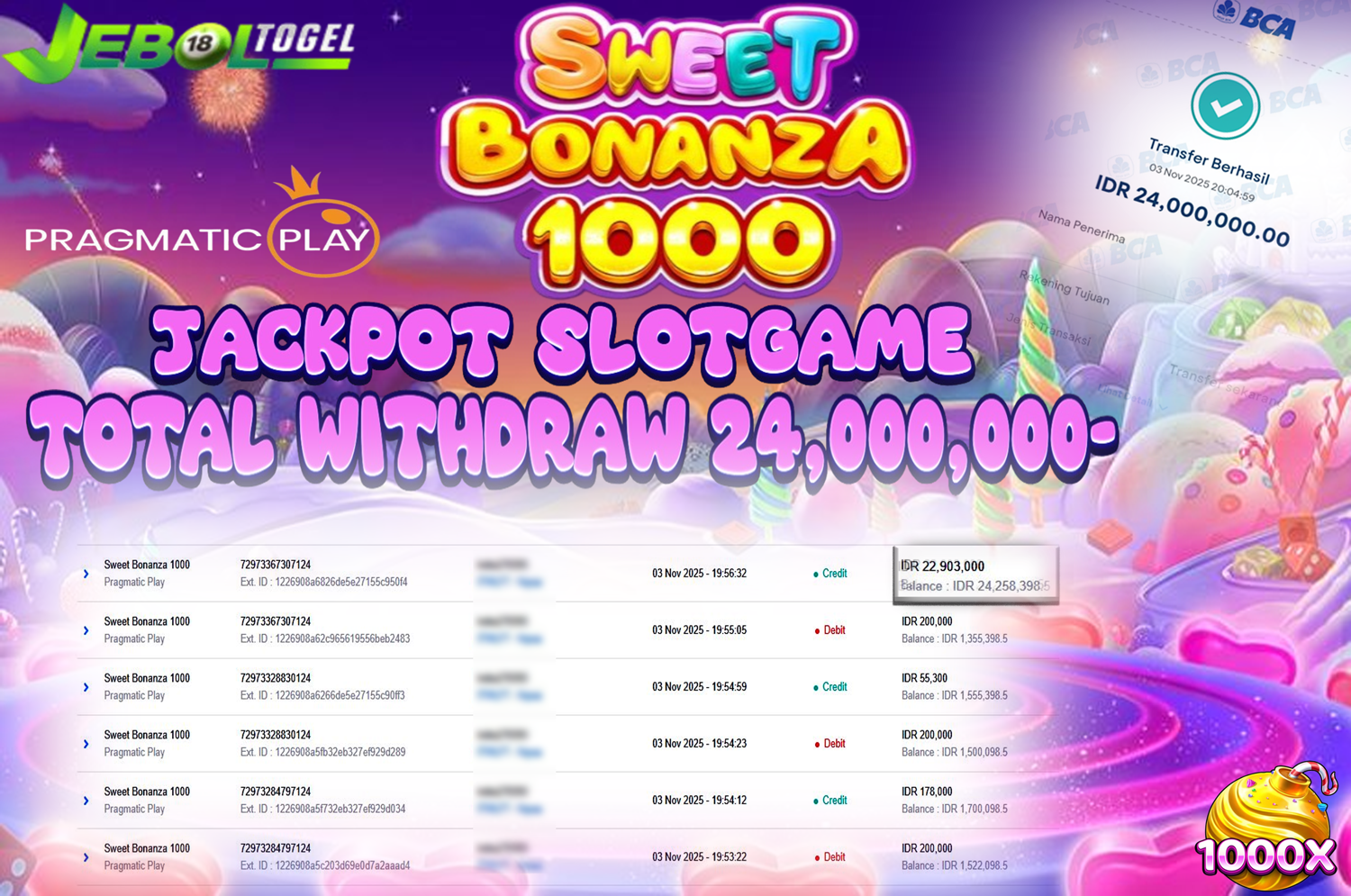 Kemenangan SLOTGAME( Sweet Bonanza 1000) Segera bergabung dengan kami JEBOLTOGEL, SITUS TERBESAR dan TERPERCAYA yang pasti BAYAR JP ANDA !
