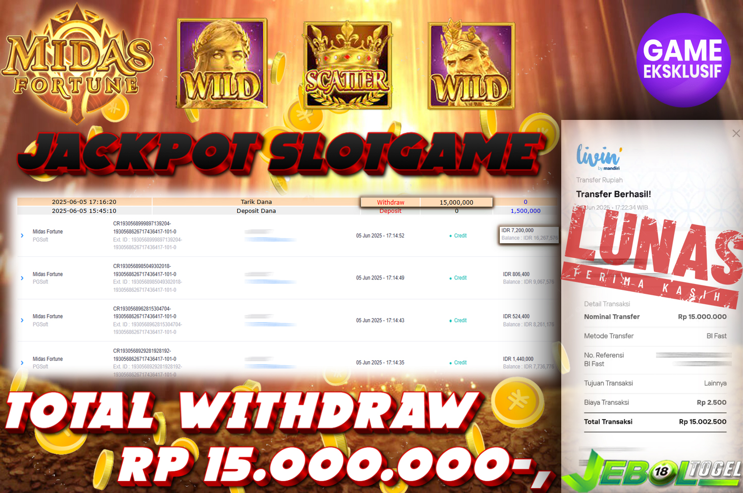 Kemenangan SLOTGAME MIDAS FORTUNE ( PGSoft ) Segera bergabung dengan kami JEBOLTOGEL, SITUS TERBESAR dan TERPERCAYA yang pasti BAYAR JP ANDA