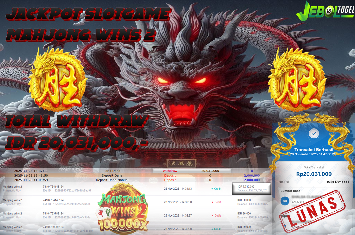 Kemenangan SLOTGAME MAHJONG WAYS 2 ( PGSOFT ) Segera bergabung dengan kami JEBOLTOGEL, SITUS TERBESAR dan TERPERCAYA yang pasti BAYAR JP ANDA!