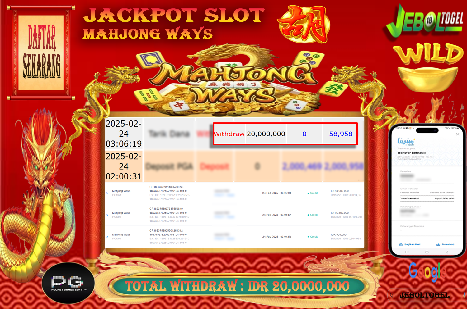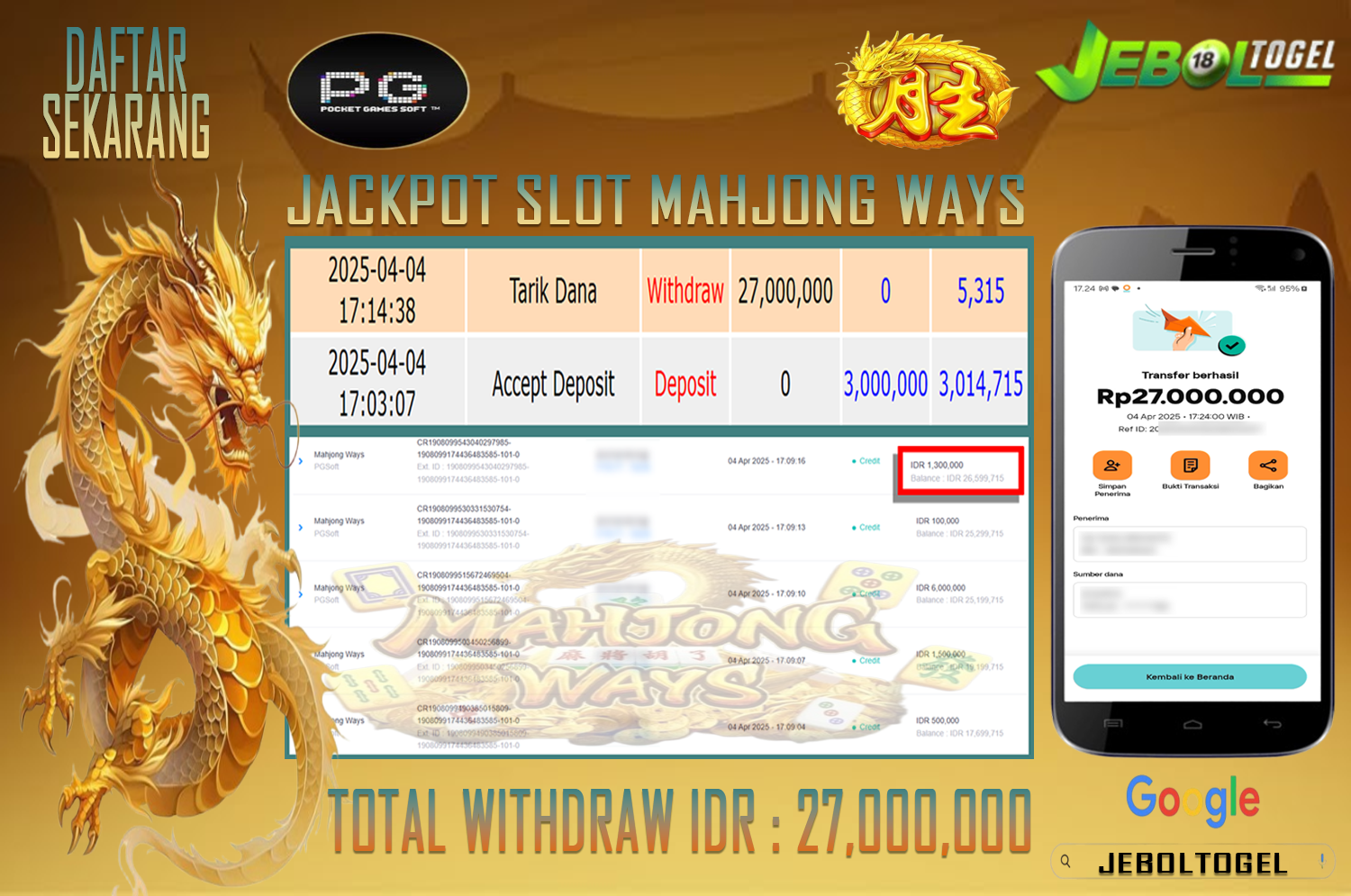 Kemenangan SLOTGAME Mahjong Ways ( PGSoft ) Segera bergabung dengan kami JEBOLTOGEL, SITUS TERBESAR dan TERPERCAYA yang pasti BAYAR JP ANDA
